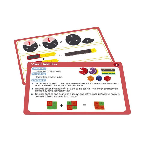 50 Fraction Activities is a set of 50 double-sided activity cards for teaching fraction knowledge and understanding. The front side provides teaching objectives, resources used and procedure. The other side provides visual examples. Maths manipulatives used effectively throughout and presented in clear photography.