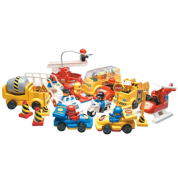 Set of 43 pieces includes police car, fire engine, bus, helicopter, motorbike, dump truck and a selection of cars.