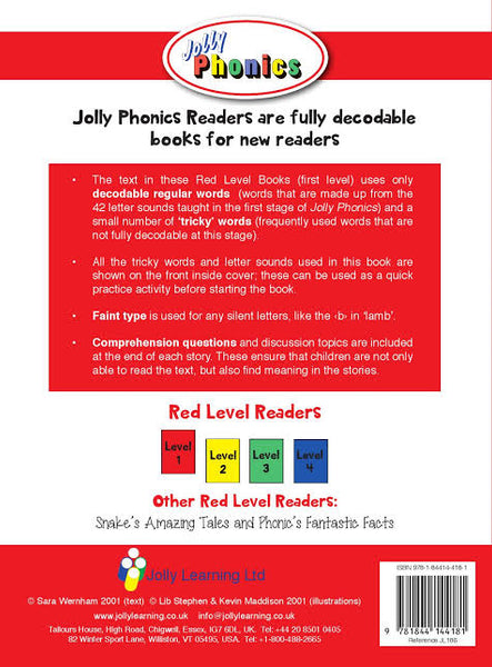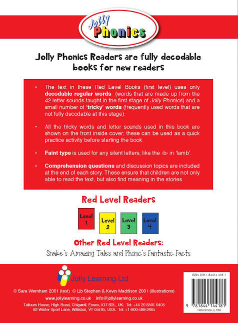 Mud and Other Stories contains six engaging fiction stories and provides comprehension questions, discussion activities and guidance for parents. The stories in the book feature words that are spelled regularly, and can be sounded out with the 42 letter sounds first taught in Jolly Phonics. At every stage the words are within the reach of children as they use their letter sound knowledge and tricky words already taught. All the tricky words and letter sounds used are shown at the beginning of the book. Light type is used as a guide for any silent letters, such as /b/ in lamb.