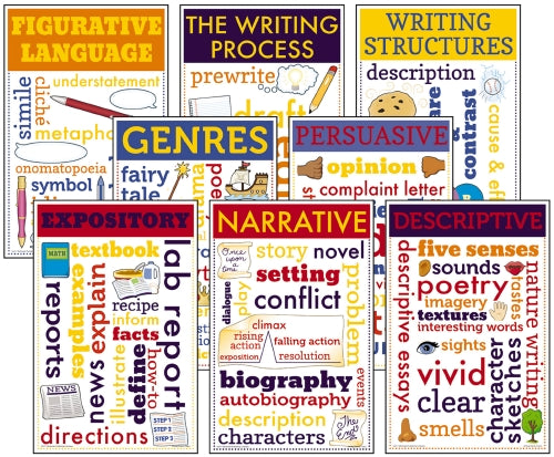 Key terms and colourful images combine to present important topics: narrative writing, persuasive writing, expository writing, descriptive writing, genres, writing structures, figurative language, and the writing process.